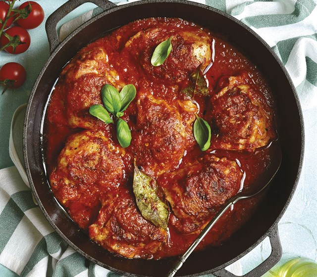Tagliare il pollo in pezzi regolari e farlo rosolare in un largo tegame con un bicchiere d’olio e un trito di erbe aromatiche; quando la carne...