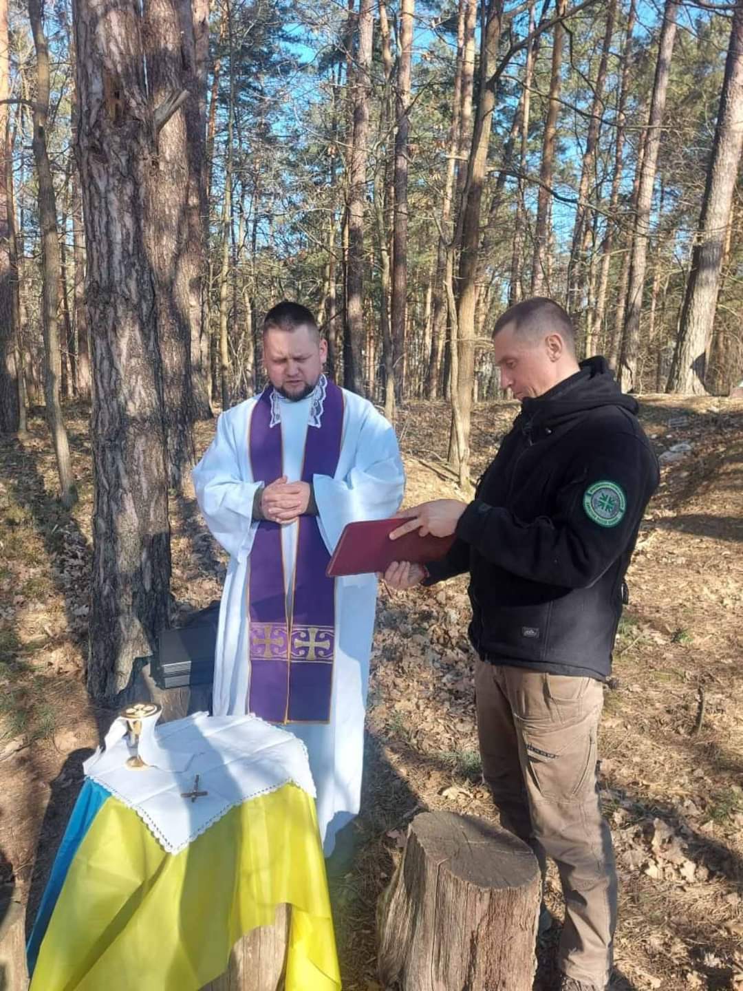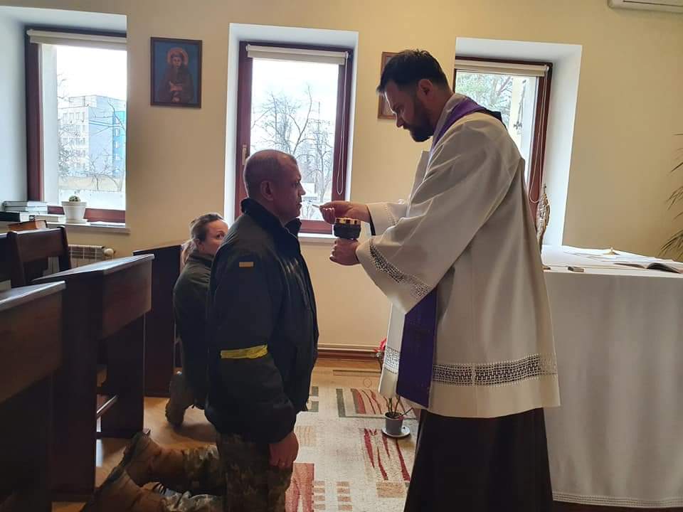Abbiamo celebrato l’Eucaristia alle 12:00, una per tutti: eravamo circa 80 persone. Durante l'Eucaristia mi è venuta l'idea di visitare i soldati che proteggono Kiev. Non ho aspettato molto. Come cappellano del Christian Relief Services ho visitato i soldati. Avevo con me il Santissimo Sacramento.