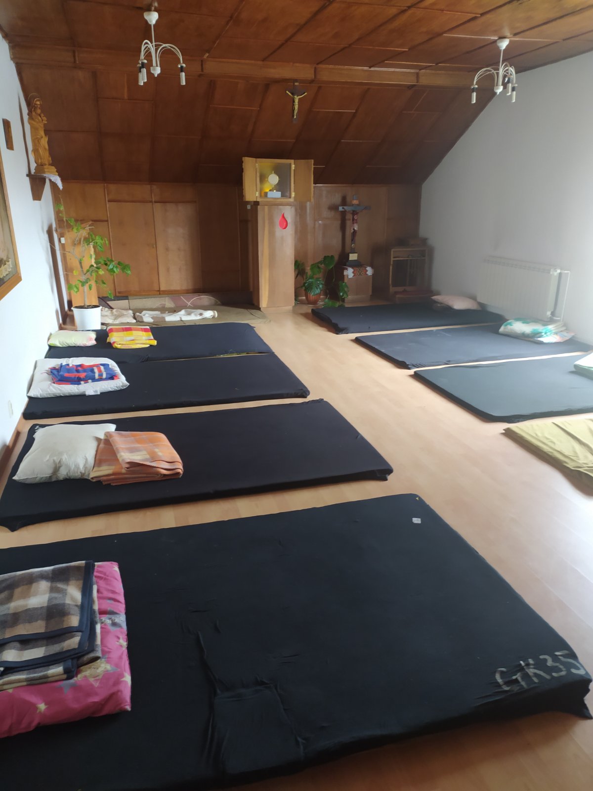 Ci stiamo prendendo cura della nostra parrocchia come al solito e dei rifugiati che vivono con noi. Secondo me ci stiamo prendendo cura di loro molto bene [acqua calda ogni giorno, cibo tre volte al giorno... Sono preoccupato che a loro piacerà così tanto che vogliono rimanere per sempre al nostro posto!