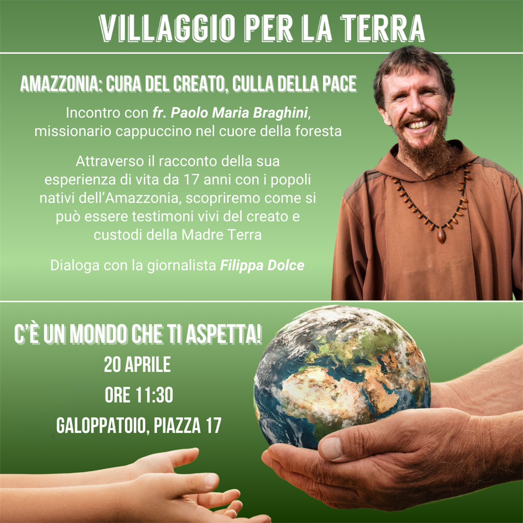 Sabato 20 Aprile dalle 11.30 alle 12.30 nella piazza 17 proponiamo un talk dal titolo: Amazzonia: cura del creato, culla della pace. Un incontro con fr. Paolo Maria Braghini, missionario cappuccino nel cuore della foresta. Attraverso il racconto della sua esperienza di vita da 17 anni con i popoli nativi dell’Amazzonia, scopriremo come si può essere testimoni vivi del creato e custodi della Madre Terra. A dialogare con fr. Paolo ci sarà la giornalista Filippa Dolce.