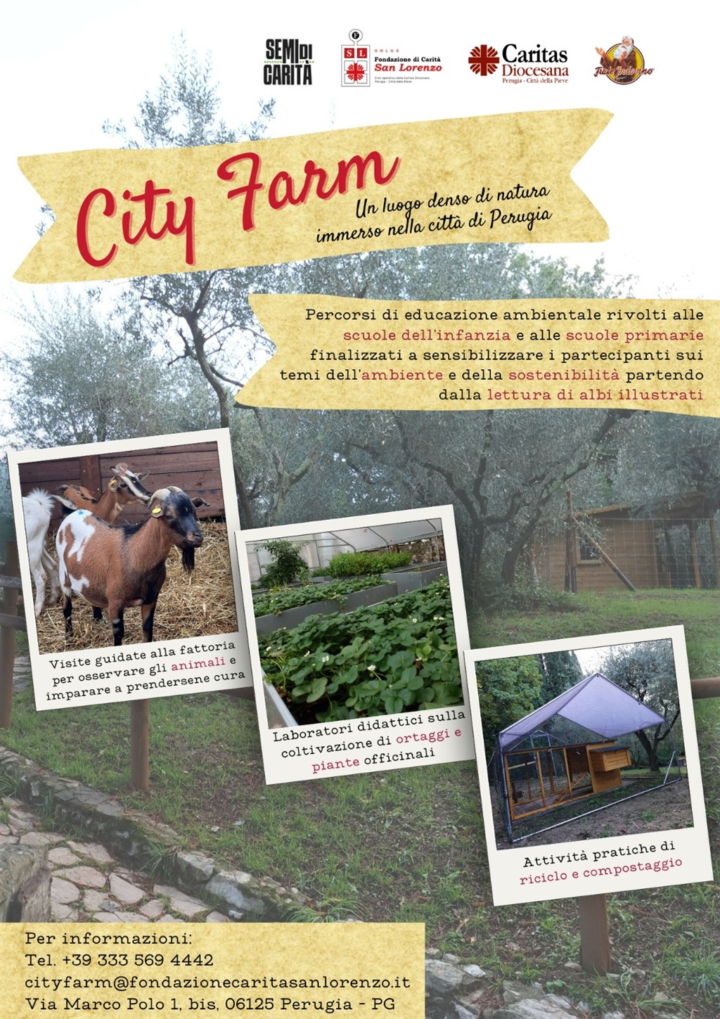 City Farm è parte del progetto Cei 8xmille “Semi di carità” promosso da Caritas diocesana Perugia-Città della Pieve e realizzato dall’ente Fondazione di Carità San Lorenzo in collaborazione con Edizioni Frate Indovino.