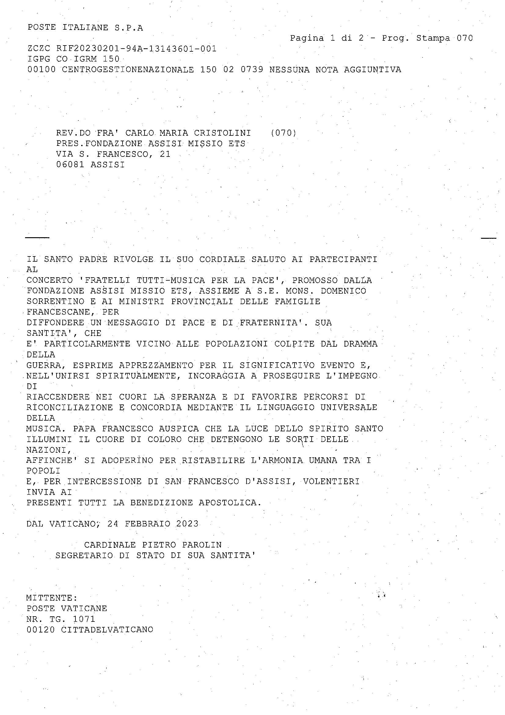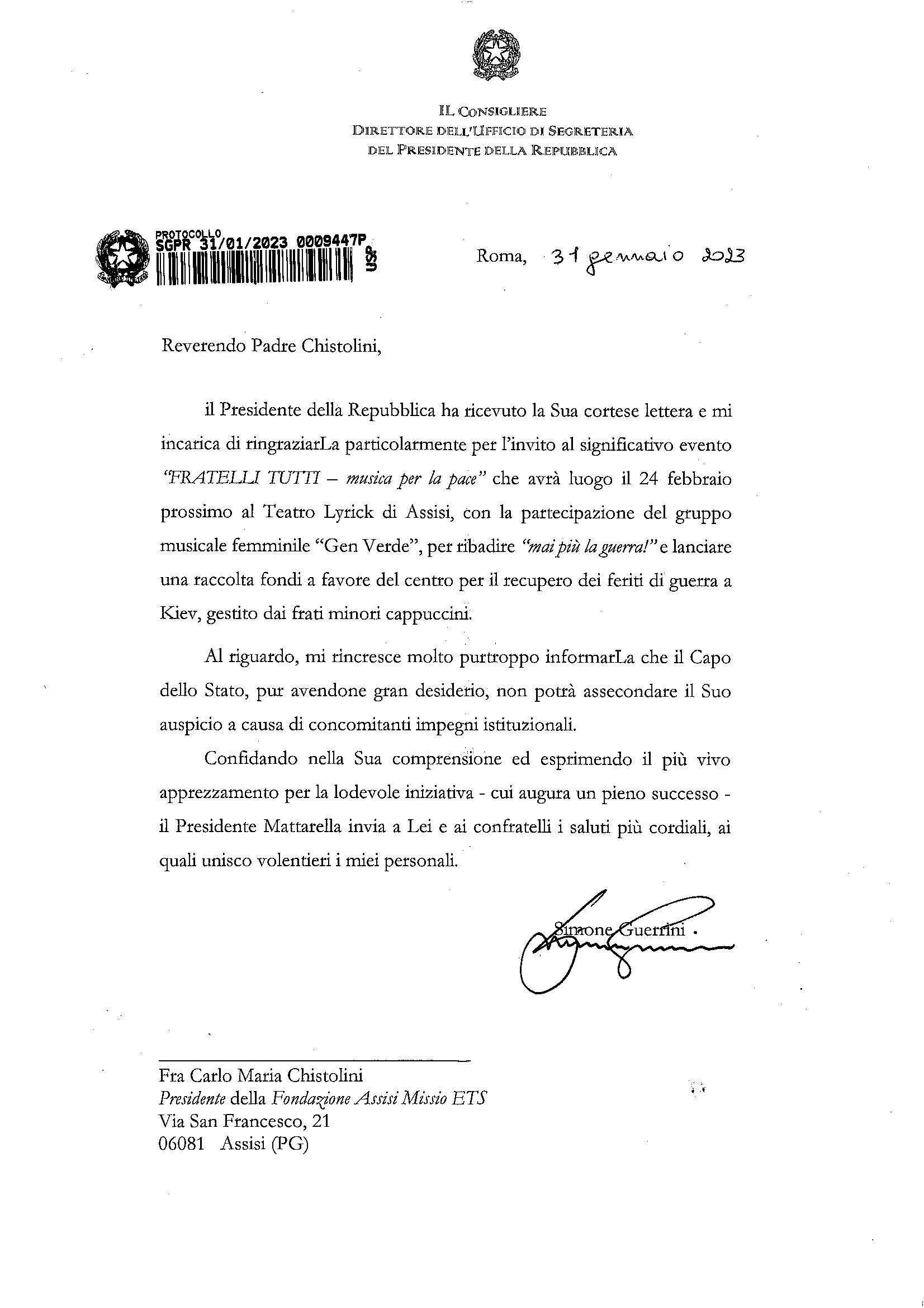 Il 24 febbraio 2023, ad un anno dall’inizio della guerra in Ucraina, con l’animo scosso dagli orrori della guerra, vogliamo ribadire la scelta assoluta e decisiva a favore della pace che fu di San Francesco. Dalla sua terra, unendoci al grido del Santo Padre e alle realtà associative e di volontariato che operano nel nostro territorio, vogliamo dire il nostro mai più la guerra e lanciare, attraverso la musica, un messaggio a sostegno dell’umanità colpita dai conflitti.