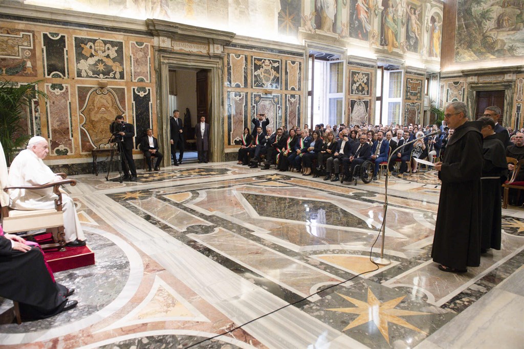 Lo scorso 31 ottobre papa Francesco ha ricevuto in udienza, nella Sala Clementina del Palazzo Apostolico in Vaticano, i Membri del Coordinamento ecclesiale per l’VIII Centenario Francescano, del Comitato per il Centenario della Famiglia Francescana e altri membri della stessa Famiglia Francescana. Circa 300 partecipanti della Famiglia Francescana, i Vescovi di Assisi, Rieti, Arezzo e le autorità civili dei luoghi francescani in Italia.