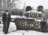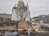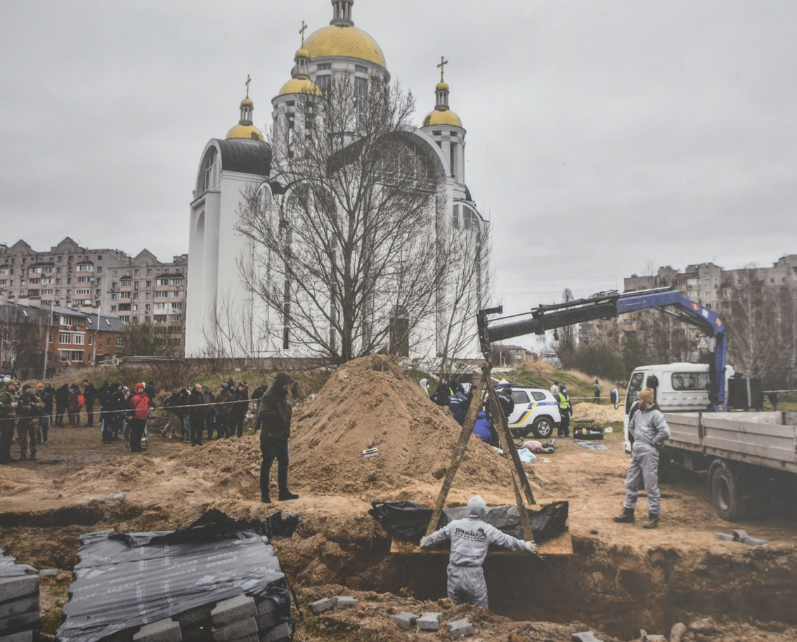 Entriamo nella freddissima chiesa di “Sant’Andrea il primo chiamato”, pareti bianche, vetrate nuove di zecca, trasparenti, non colorate. Manca ancora l’iconostasi, mancano le candele, manca tutto. C’è solo una serie di foto poggiate su cavalletti. Nella prima si riconosce Ursula von der Leyen accanto al prete Andreij, che ora è qui dinanzi a noi: nella foto si vedono ai piedi dei due una serie di sacchi da immondizia neri dai quali fuoriescono una mano, una scarpa, un gomito. Qui si è svolta una delle più gravi carneficine della prima invasione russa. O meglio, qui padre Andreij si è offerto di dare sepoltura alle decine di cadaveri che non avevano trovato posto nell’obitorio della città, e che restavano insepolte per le strade di Bucha. Padre Andreij ha ancora lacrime per la tragedia vissuta. Il 4 marzo, di fronte all’abominio di corpi lasciati all’aria aperta senza degna sepoltura, padre Andreij si è rivolto ai soldati russi offrendosi di dare una tomba ai morti abbandonati. Naturalmente non c’era ancora un cimitero attorno alla chiesa, ma il terreno era disponibile. Per cui, con l’aiuto di gente di buona volontà, ha scavato una larga trincea nella quale hanno deposto le salme di una sessantina di vittime chiuse precariamente in sacchi di plastica neri. Il 10 marzo il primo cadavere è stato sepolto. Naturalmente, appena liberata la cittadina, dopo il 30 marzo, sono arrivate anche le squadre incaricate di indagare sui delitti contro l’umanità eventualmente commessi dai militari russi, e quindi le sepolture sono state documentate adeguatamente.