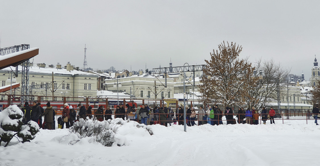 Arrivati a Przemyśl, c’è ancora da passare il controllo polacco dei passaporti. Al freddo e al gelo (-6 per il termometro, percepita -14) ci mettiamo in fila che, meno male, avanza rapida. Poi la sorpresa, una volta arrivati fuori dai cancelli della dogana: una lunga fila di donne, vecchi e bambini è in attesa del controllo del passaporto, come noi stessi abbiamo avuto modo di sperimentare due giorni fa. Anche coloro che ora fanno la fila hanno dovuto attendere il treno in ritardo da Kyiv. Solo che per noi era mat-tina, per loro è notte fon-da e fa un freddo boia, che fa battere letteralmente i denti. È questa lunga fila notturna l’immagine che resterà nel nostro cuore e nel nostro sguardo, come il simbolo della resistenza e dell’incredibile tenacia degli ucraini.