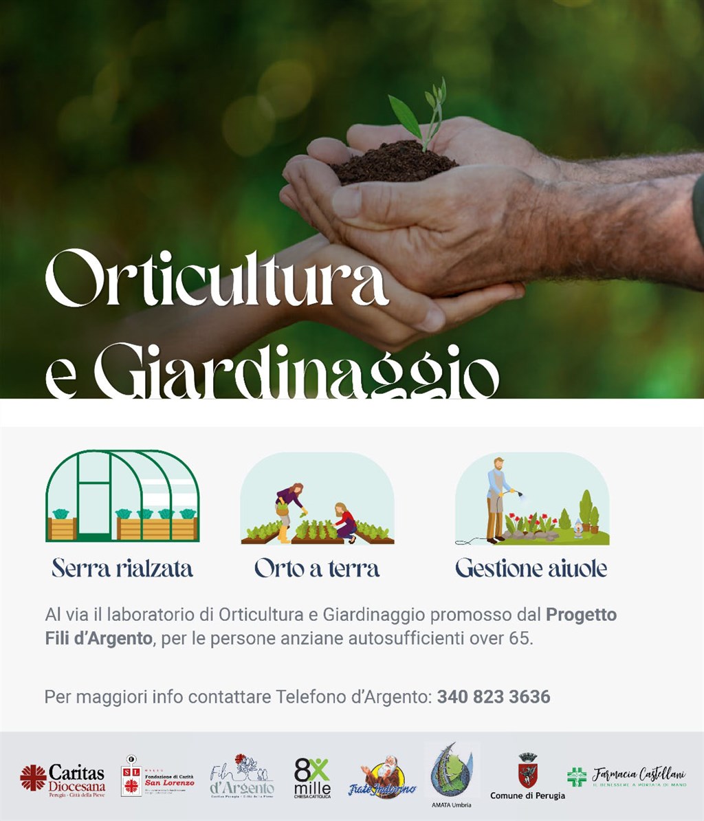 E’ iniziato lo scorso 28 aprile il laboratorio di orticultura e giardinaggio promosso dal progetto Fili d’Argento per le persone anziane autosufficienti over 65 e sarà ufficialmente inaugurato il prossimo 17 Maggio alla presenza di Sua Eminenza Cardinal Bassetti.