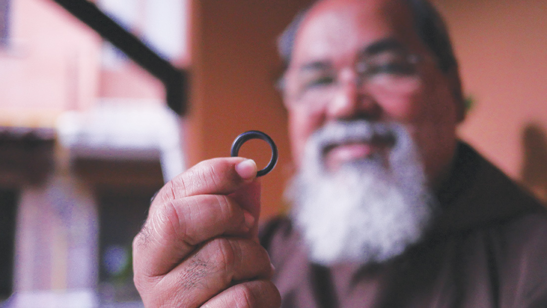 Prima di salutare fra Paulo, scorgiamo sulle sue dita un anello di legno scuro, molto particolare e gli chiediamo di cosa si tratta...