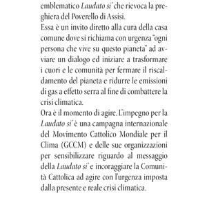 Religiosi o atei, tutti percepiamo la gravità dell’immane catastrofe ecologica che incombe su di noi. Qual è una delle possibili risposte? Nel giugno 2015, Papa Francesco ha pubblicato la sua seconda enciclica dal titolo emblematico Laudato si’ che rievoca la preghiera del Poverello di Assisi. Essa è un invito diretto alla cura della casa comune, dove si richiama con urgenza “ogni persona che vive su questo pianeta” ad avviare un dialogo ed iniziare a trasformare i cuori e le comunità per fermare il riscaldamento del pianeta e ridurre le emissioni di gas a effetto serra al fine di combattere la crisi climatica. Ora è il momento di agire. L’impegno per la Laudato si’ è una campagna internazionale del Movimento cattolico mondiale per il clima (GCCM) e delle sue organizzazioni per sensibilizzare riguardo al messaggio della Laudato si’ e incoraggiare la Comunità Cattolica ad agire con l’urgenza imposta dalla presente e reale crisi climatica.