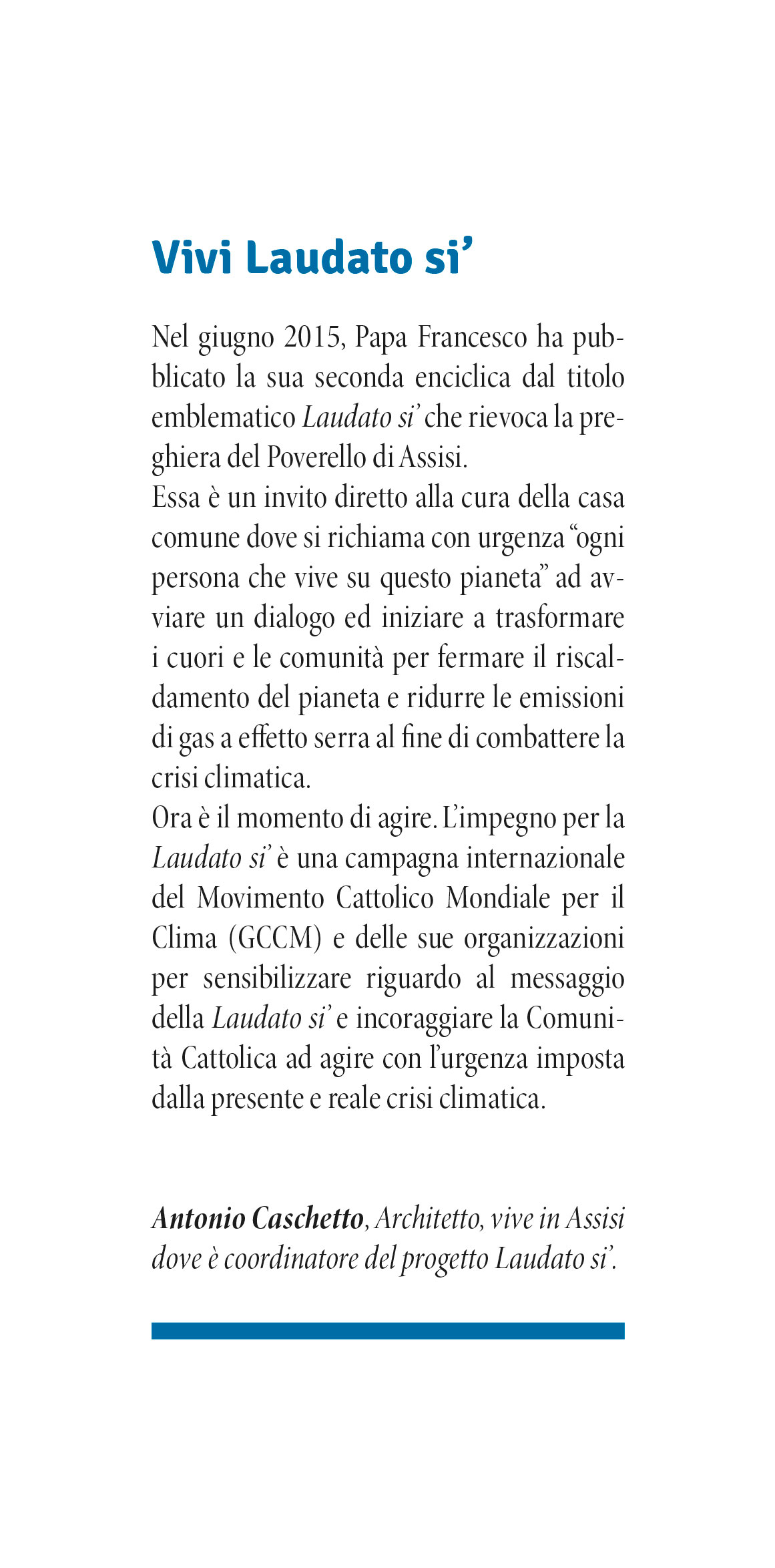 L’autore: Antonio Caschetto, Architetto, vive in Assisi dove П coordinatore del progetto Laudato si’ per conto del Movimento cattolico mondiale per il clima (GCCM).