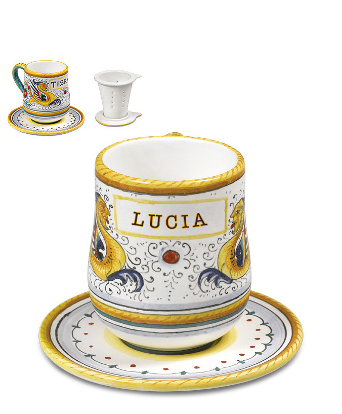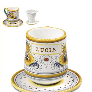 La TISANIERA decoro "DERUTA" dipinta a mano e personalizzabile con il tuo nome e quello dei tuoi cari. Realizzata dai Maestri ceramisti di Deruta (PG) è composta da un piattino, una tazza, un filtro e un coperchio.