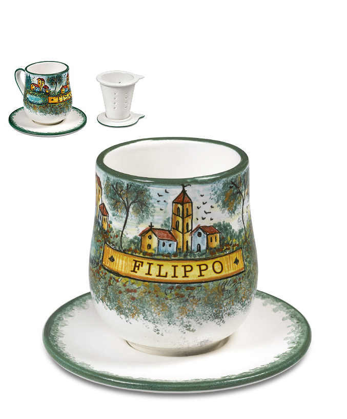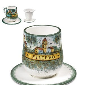 La TISANIERA decoro "PAESAGGIO" dipinta a mano e personalizzabile con il tuo nome e quello dei tuoi cari. Realizzata dai Maestri ceramisti di Deruta (PG) è composta da un piattino, una tazza, un filtro e un coperchio.