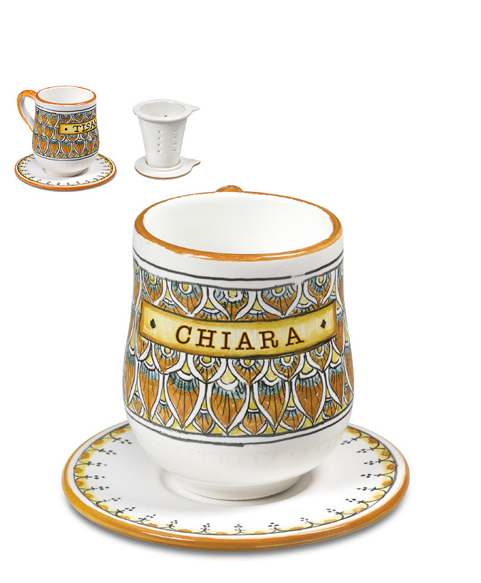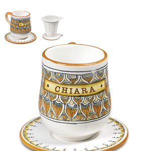 La TISANIERA decoro "PAVONE" dipinta a mano e personalizzabile con il tuo nome e quello dei tuoi cari. Realizzata dai Maestri ceramisti di Deruta (PG) è composta da un piattino, una tazza, un filtro e un coperchio.