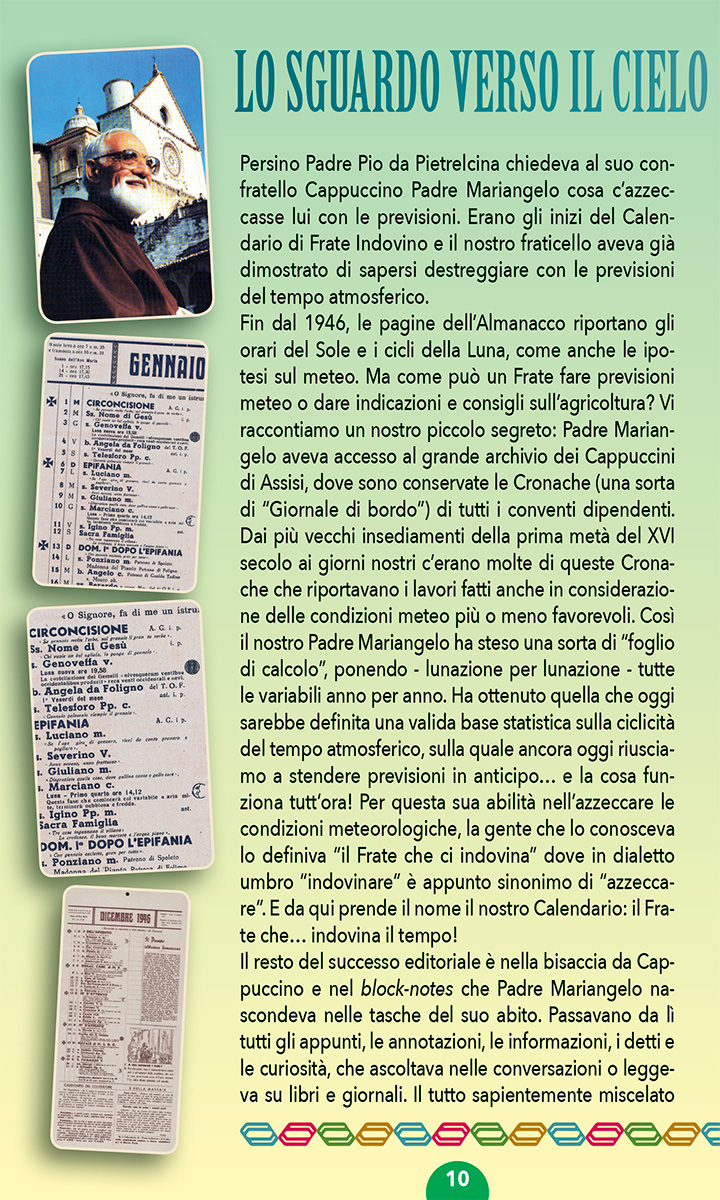 Ed ora, carissimi, continuiamo a guardare avanti con fiducia! La missione di Frate Indovino continua, adattandosi ai tempi presenti, senza perdere il verum ed il proprium del suo esistere... e certo, non potrà riuscire senza l’amicizia, la fiducia e l’aiuto concreto di voi lettori che mai ci sono mancati.