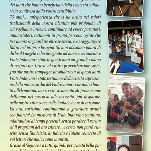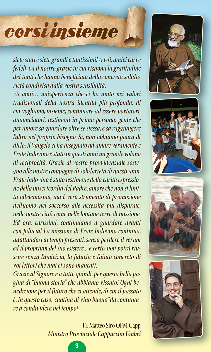 75 anni… un’esperienza che ci ha unito nei valori tradizionali della nostra identità più profonda, di cui vogliamo, insieme, continuare ad essere portatori, annunciatori, testimoni in prima persona: gente che per amore sa guardare oltre se stessa, e sa raggiungere l’altro nel proprio bisogno. Sì, non abbiamo paura di dirlo: il Vangelo ci ha insegnato ad amare veramente e Frate Indovino è stato in questi anni un grande volano di reciprocità. Grazie al vostro provvidenziale sostegno alle nostre campagne di solidarietà di questi anni, Frate Indovino è stato testimone della carità espressione della misericordia del Padre, amore che non si limita all’elemosina, ma è vero strumento di promozione dell’uomo nel soccorso alle necessità più disparate, nelle nostre città come nelle lontane terre di missione.
