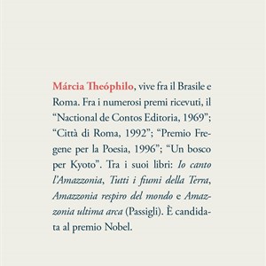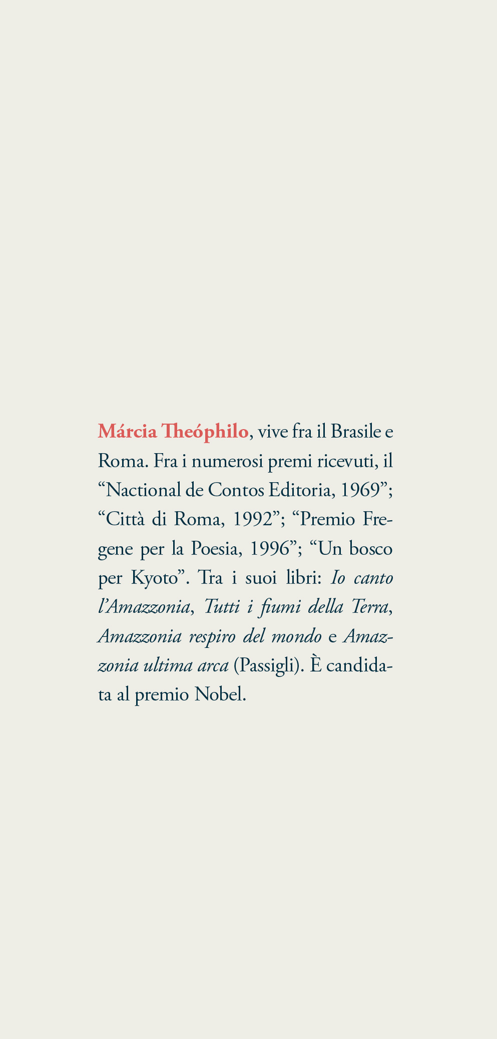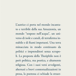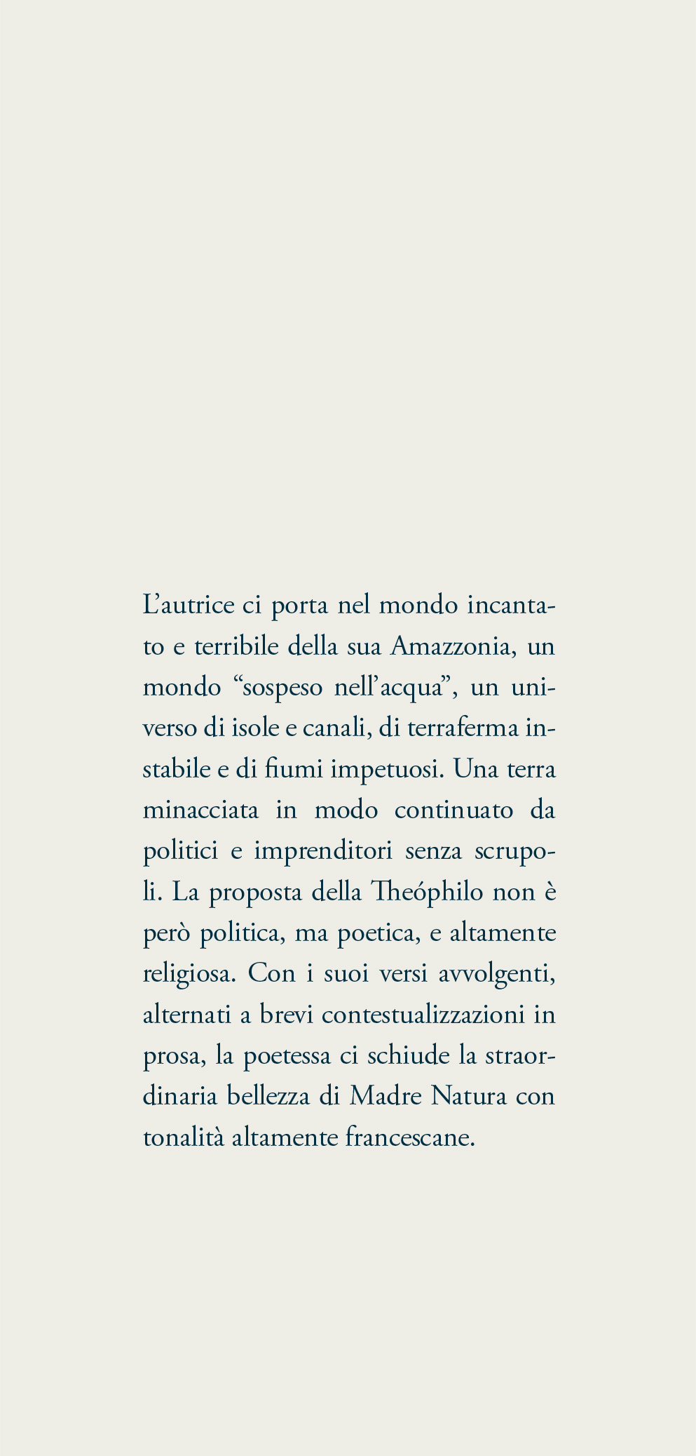 Il volume | Marcia Theophilo ci porta nel mondo incantato e terribile della sua Amazzonia, un mondo “sospeso nell’acqua”, un universo di isole e canali, di terraferma instabile e di fiumi impetuosi. Una terra minacciata in modo continuato e scellerato, da politici e imprenditori senza scrupoli, azione che potrebbe finire col distruggere il più grande polmone verde del mondo. La proposta della Theophilo non è però politica, ma poetica, e altamente religiosa. Con i suoi versi avvolgenti, alternati a brevi contestualizzazioni in prosa, la poetessa ci schiude la straordinaria bellezza di Madre Natura con tonalità altamente francescane. Nessun sincretismo, nessuna divinizzazione della Natura, ma la giusta considerazione di un mondo, di un ecosistema fatto di terra e di acqua che rimanda continuamente al Creatore.