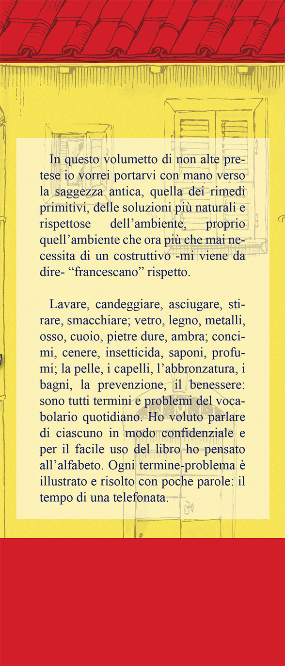 Questo libro è un’agile ed utilissima guida che, con le sue oltre 500 voci poste in ordine alfabetico, offre più di 2000 segreti, consigli, rimedi basati sulla solida tradizione ed aiuta in modo semplice ed immediato a risolvere i piccoli grandi “drammi casalinghi” del vivere quotidiano. Il Lettore è condotto per mano verso quegli antichi saperi, figli di una sana esperienza, grazie ai quali si può rimediare nel modo più appropriato a tantissime necessità domestiche, sempre nel pieno rispetto dell’ambiente e con un occhio anche alla spesa. Integra il volume una sezione speciale riservata ai seguenti argomenti: calendario ragionato dei lavori domestici periodici; simboli di rischio chimico; simboli di pericolo; simboli relativi al trattamento dei tessuti, tabelle internazionali di conversione per le taglie di abbigliamento, simboli per l’utilizzo delle stoviglie, marchi, bollini, etichette; simboli attinenti al riciclaggio delle materie plastiche; informazioni nutrizionali e scale di temperatura