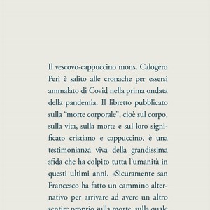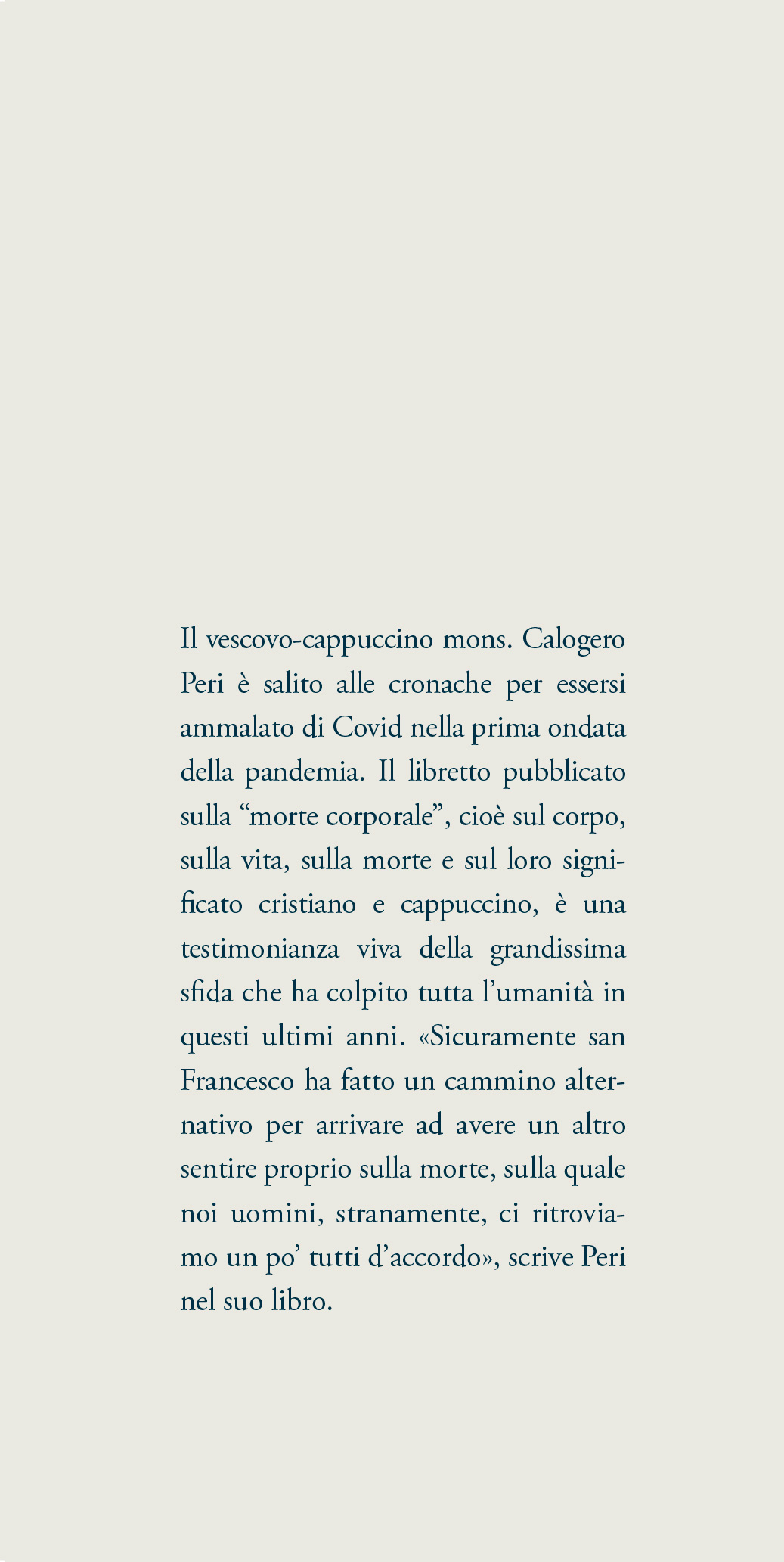 Il volume | Il vescovo-cappuccino mons. Calogero Peri è salito alle cronache per essersi ammalato di Covid nella prima ondata della pandemia. Questo volume sulla "morte corporale", cioè sul corpo, sulla vita, sulla morte e sul loro significato cristiano e cappuccino, è una testimonianza viva della grandissima sfida che ha colpito l'umanità in questi ultimi anni.