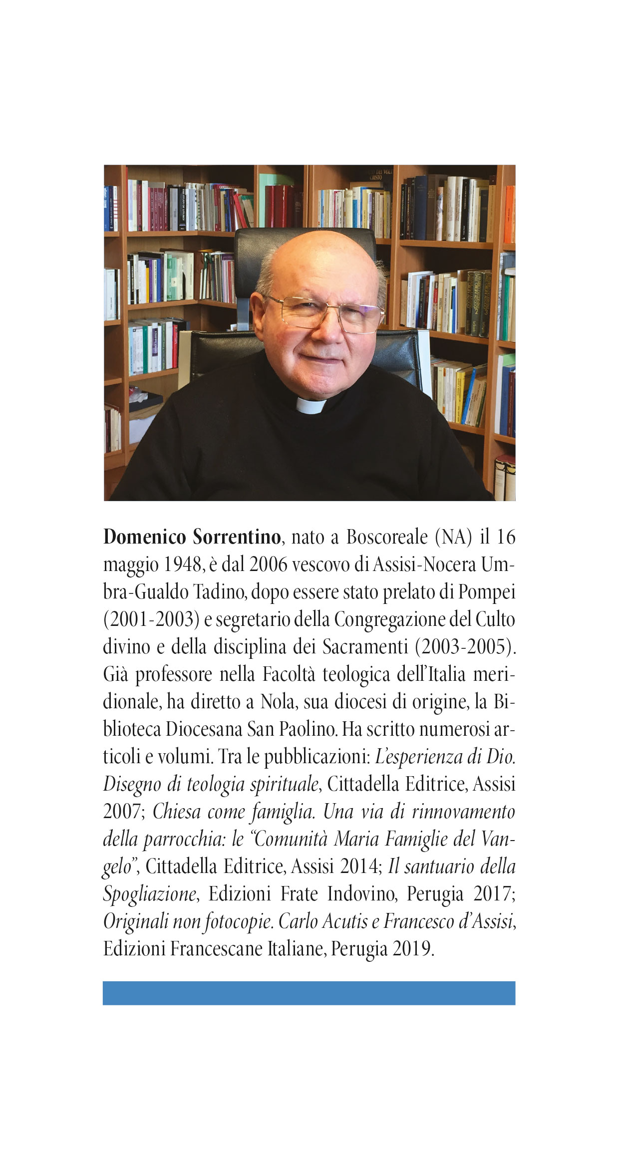 L’Autore | Domenico Sorrentino, nato a Boscoreale (NA) il 16 maggio 1948, è dal 2006 vescovo di Assisi-Nocera Umbra-Gualdo Tadino, dopo essere stato prelato di Pompei (2001-2003) e segretario della Congregazione del Culto divino e della disciplina dei Sacramenti (2003-2005). Già professore nella Facoltà teologica dell’Italia meridionale, ha diretto a Nola, sua diocesi di origine, la Biblioteca Diocesana San Paolino. Ha scritto numerosi articoli e volumi.