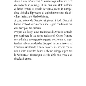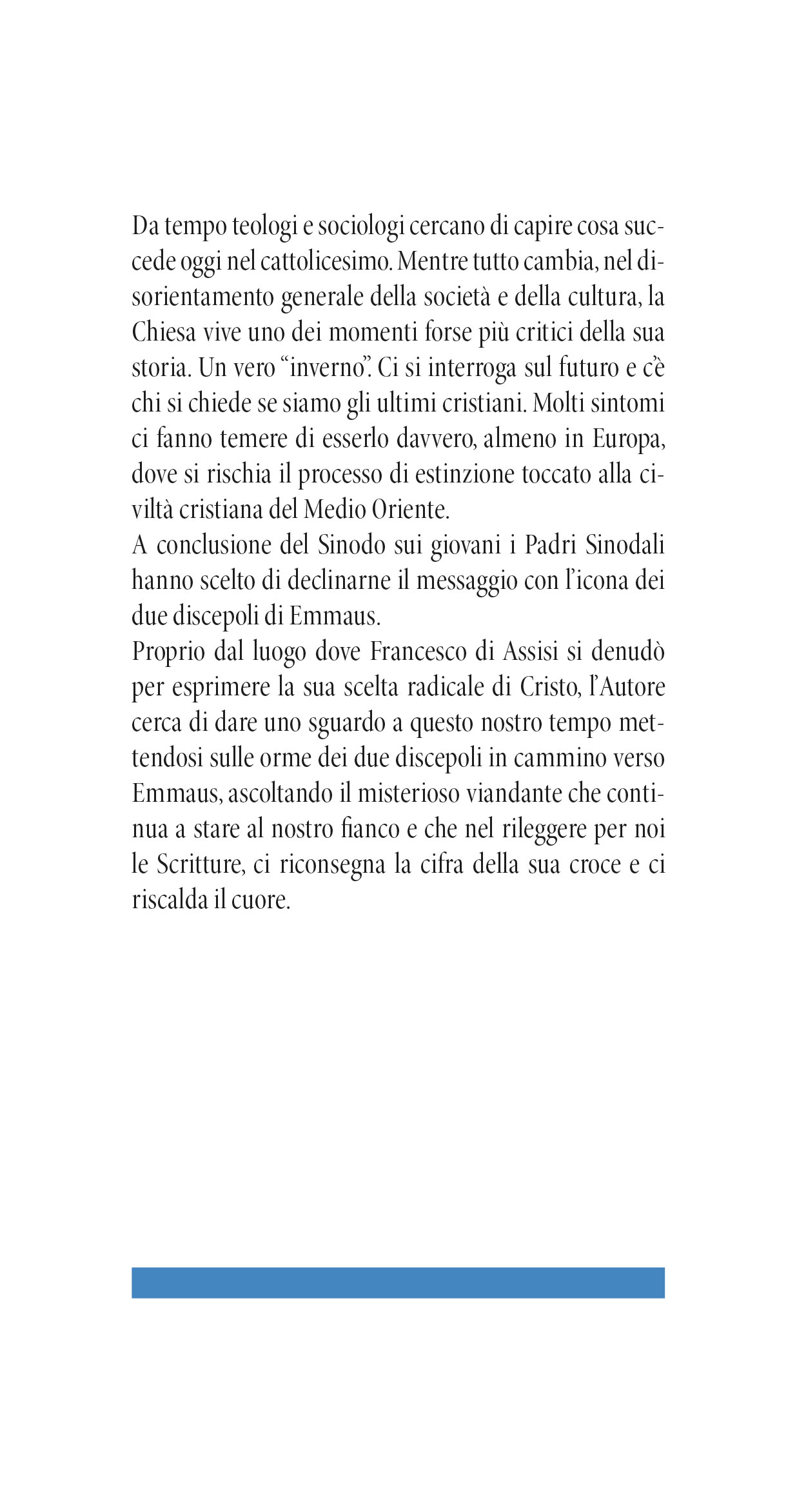 Da tempo teologi e sociologi cercano di capire che cosa succede oggi nel cattolicesimo. Mentre tutto cambia, nel disorientamento generale della società e della cultura, la Chiesa vive uno dei momenti forse più critici della sua storia. Un vero “inverno”. Ci si interroga sul futuro e c’è chi si chiede se siamo gli ultimi cristiani. Molti sintomi ci fanno temere di esserlo davvero, almeno in Europa, dove si rischia il processo di estinzione toccato alla civiltà cristiana del Medio Oriente. Dal luogo dove otto secoli fa Francesco di Assisi si spogliò fino alla nudità per esprimere la sua scelta radicale di Cristo, obbedendo alla voce del Crocifisso che gli chiedeva di “riparare la sua casa in rovina”, l’Autore dà uno sguardo generale al nostro tempo, additando le vie di un nuovo slancio evangelizzatore centrato sulle piccole comunità plasmate di Vangelo e fraternità. Una “nuova primavera” della Chiesa, possibile se, come i discepoli di Emmaus, ascoltiamo il Risorto che cammina al nostro fianco e ci riscalda il cuore.