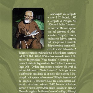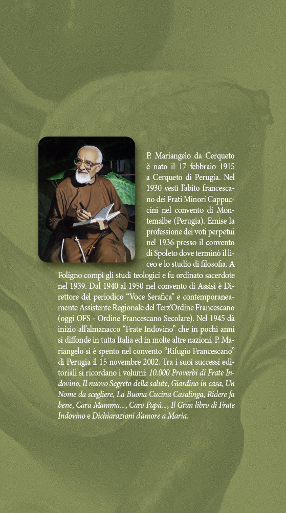 L’autore | Fra Mariangelo da Cerqueto (1915-2002), colui che ha fondato Frate Indovino, fu ordinato sacerdote nel 1939. Nel 1946 ha dato vita al celeberrimo Almanacco di Frate Indovino. Tra le sue pubblicazioni ricordiamo: 10.000 proverbi di Frate Indovino, Giardino in casa, Ridere fa bene, La buona cucina casalinga, ecc.