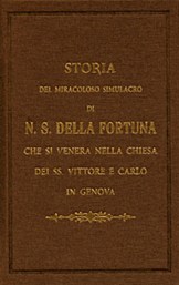 Ai Lettori del nostro Calendario Frate Indovino offriamo una ristampa anastatica (cioè una riproduzione fedele) del prezioso ed introvabile volumetto “Breve narrazione storica degli avvenimenti riguardanti il Miracoloso Simulacro di Nostra Signora della Fortuna che si venera nella chiesa dei SS. Vittore e Carlo in Genova”, stampato nel capoluogo ligure nel 1898, e dal quale si è tratto spunto per il calendario di quest’anno. In esso vengono descritti, con particolare cura, gli avvenimenti relativi al miracolo che vi abbiamo raccontato e tutte le altre straordinarie grazie operate dalla Miracolosa Statua dall’anno 1636 al 1898. Il testo è impreziosito da una rilegatura in filo refe, che prevede una copertina rigida cartonata e ricoperta in tela, con sovrimpressioni in oro a caldo