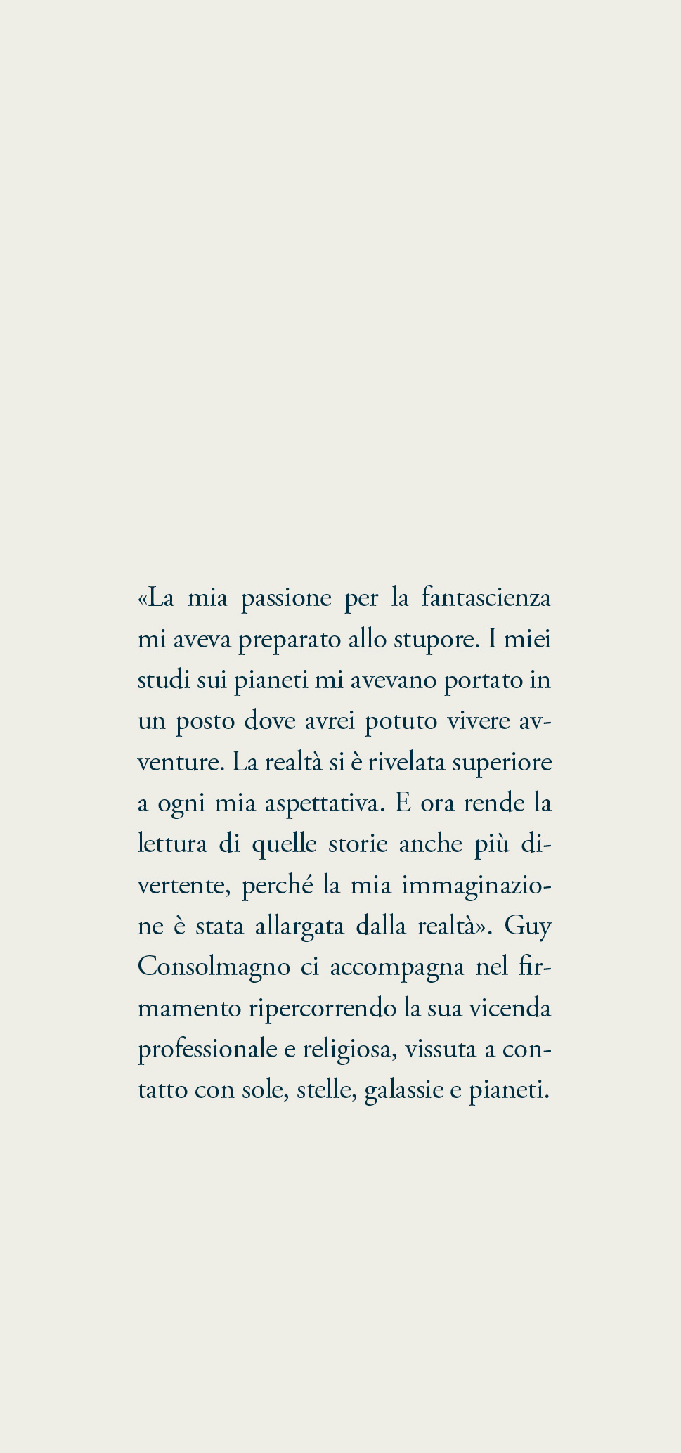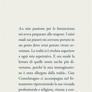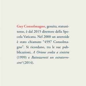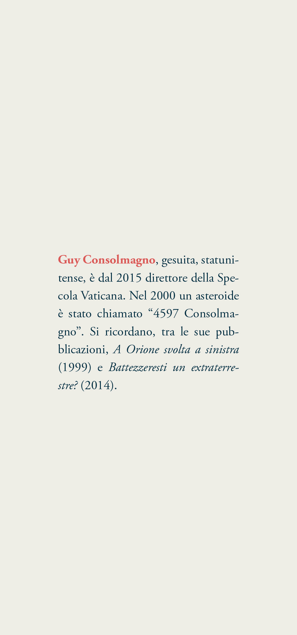 L’autore | Guy Consolmagno, gesuita statunitense, ha studiato tra l’altro al celebre MIT. Nel 1983 è entrato nel Peace Corps, una organizzazione di volontariato statunitense, ed ha vissuto per due anni in Kenya. Ha lavorato alla Specola Vaticana, di cui è direttore dal 2015. Nel 2000 il suo nome è stato associato a un asteroide. Consolmagno è anche autore di un centinaio di articoli scientifici di grande spessore scientifico e di vari libri di astronomia per il grande pubblico, tradotti in diverse lingue.