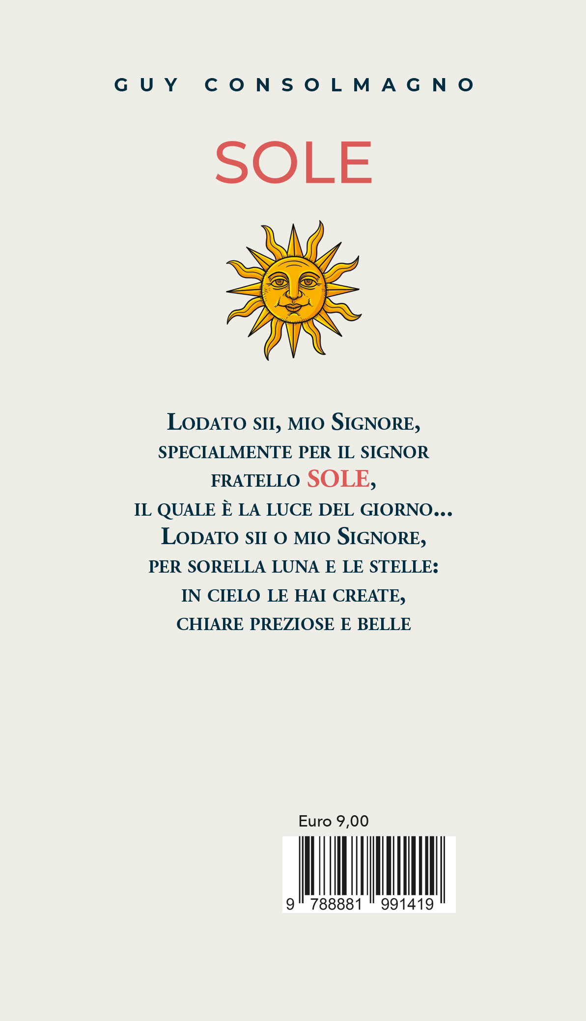 Il volume | Il Cantico delle Creature parla del sole, ma anche della luna e delle stelle, intendendo con ciò abbracciare il cosmo intero. Il sole viene citato come prima delle creature, si direbbe “una premessa” di ogni vita possibile sulla Terra, pur essendo fuori dalla Terra. Consolmagno affronta con grande ispirazione e continui riferimenti alla propria esperienza personale le realtà più immense che possano immaginarsi con la lente dello scienziato credente che riesce a vedere l’infinitamente grande nell’infinitamente piccolo, e viceversa.