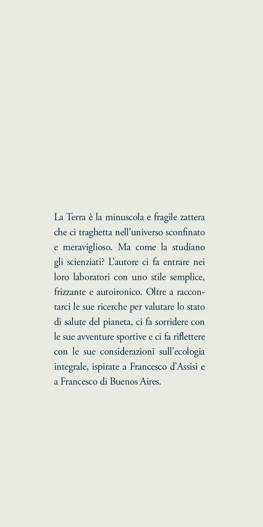 L’autore ci fa entrare nei loro laboratori con uno stile semplice, frizzante e autoironico. Oltre a raccontarci le sue ricerche per valutare lo stato di salute del pianeta, ci fa sorridere con le sue avventure sportive e ci fa riflettere con le sue considerazioni sull’ecologia integrale, ispirate a Francesco d’Assisi e Francesco di Buenos Aires.