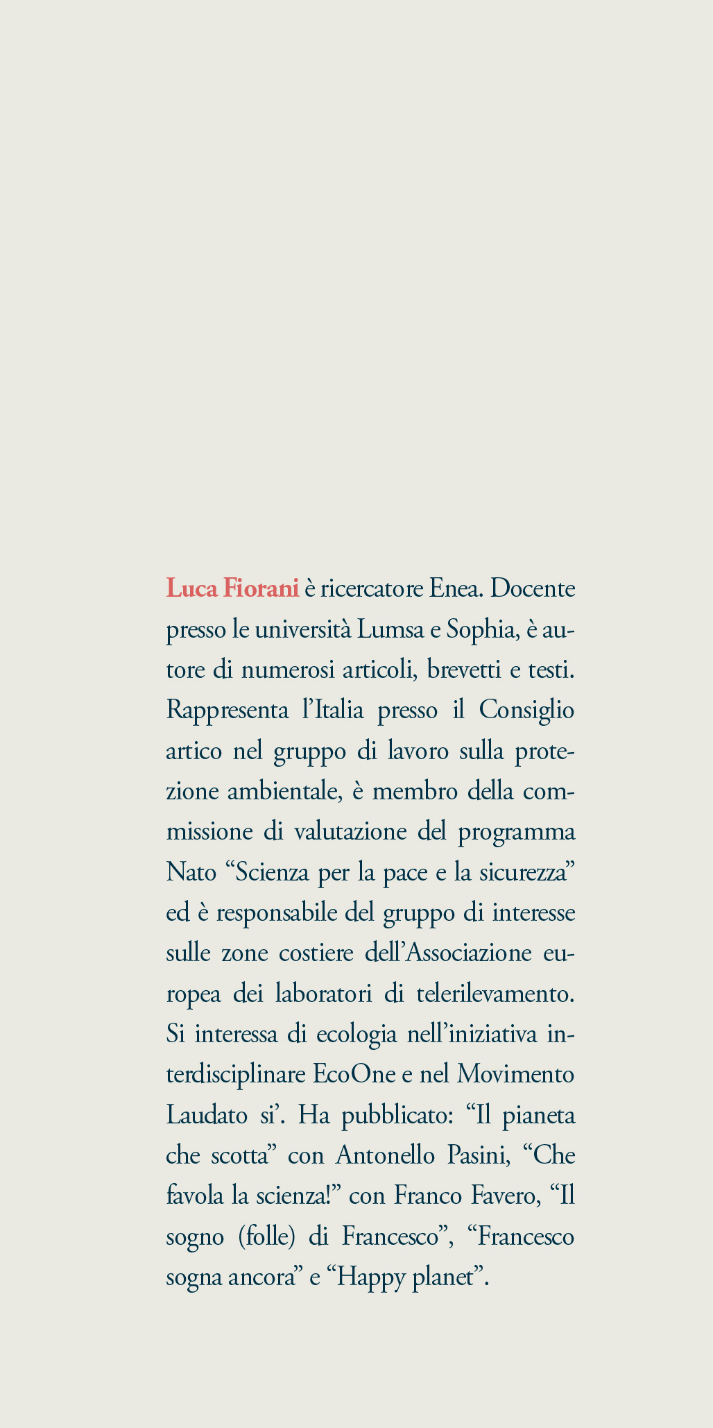 L’autore | Luca Fiorani è ricercatore Enea. Docente presso le università Lumsa e Sophia, è autore di numerosi articoli, brevetti e testi. Rappresenta l’Italia presso il Consiglio artico nel gruppo di lavoro sulla protezione ambientale, è membro della commissione di valutazione del programma Nato “Scienza per la pace e la sicurezza” ed è responsabile del gruppo di interesse sulle zone costiere dell’Associazione europea dei laboratori di telerilevamento. Si interessa di ecologia nell’iniziativa interdisciplinare EcoOne e nel Movimento Laudato si’. Ha pubblicato: “Il pianeta che scotta” con Antonello Pasini, “Che favola la scienza!” con Franco Favero, “Il sogno (folle) di Francesco”, “Francesco sogna ancora” e “Happy planet”.