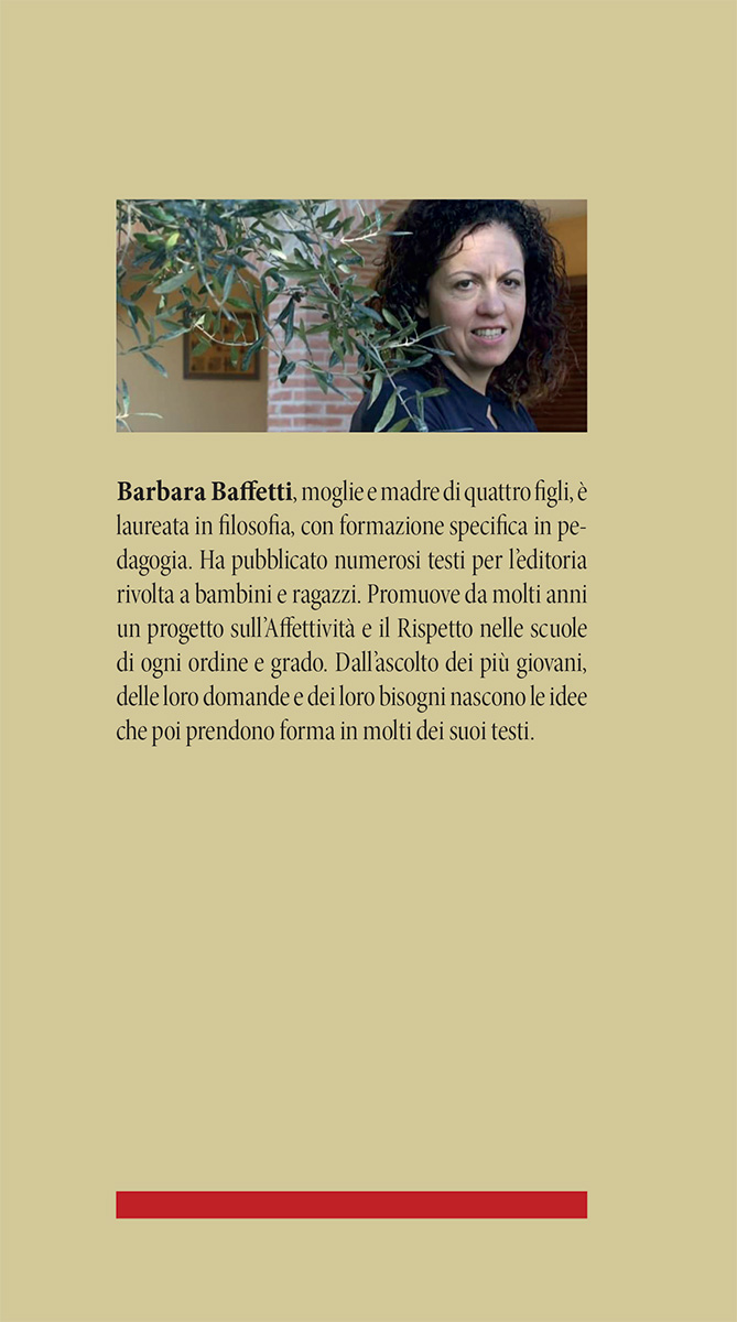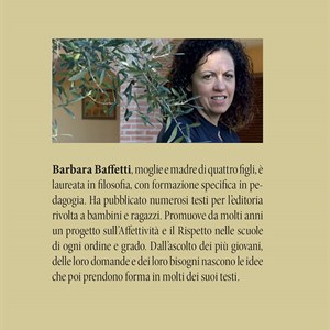 L’autore | Barbara Baffetti, moglie e madre di quattro figli, è laureata in filosofia, con formazione specifica in pedagogia. Ha pubblicato numerosi testi per l’editoria rivolta a bambini e ragazzi. Promuove da molti anni un progetto sull’Affettività e il Rispetto nelle scuole di ogni ordine e grado; dall’ascolto dei più giovani, delle loro domande e dei loro bisogni nascono le idee che poi prendono forma in molti dei suoi testi.