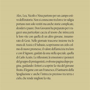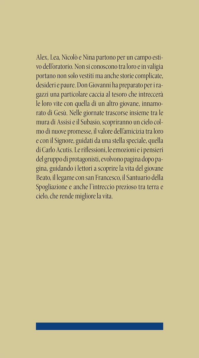 Nella pubblicazione | Alex, Lea, Nicolò e Nina partono per un campo estivo dell’oratorio; non si conoscono tra loro e in valigia portano non solo vestiti ma anche storie complicate, desideri e paure. Don Giovanni creativo sacerdote della parrocchia, ha preparato per i ragazzi una particolare caccia al tesoro che intreccerà le loro vite con quella di un altro giovane, molto innamorato di Gesù. Nelle giornate trascorse insieme tra le mura di Assisi e il Subasio, scopriranno un cielo colmo di nuove promesse, il valore dell’amicizia tra loro e con il Signore, guidati da una stella speciale, quella di Carlo Acutis. Le riflessioni, le emozioni e i pensieri del gruppo di protagonisti, evolvono pagina dopo pagina, guidando i lettori a scoprire la vita del giovane Beato, il legame con san Francesco, il Santuario della Spogliazione e anche l’intreccio prezioso tra terra e cielo, che sa rendere migliore la vita.