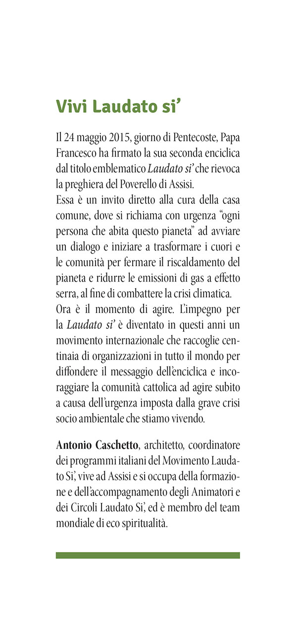 L'autore | Antonio Caschetto, architetto di professione, vive ad Assisi, ed è il coordinatore dei programmi italiani del Movimento Laudato sì.